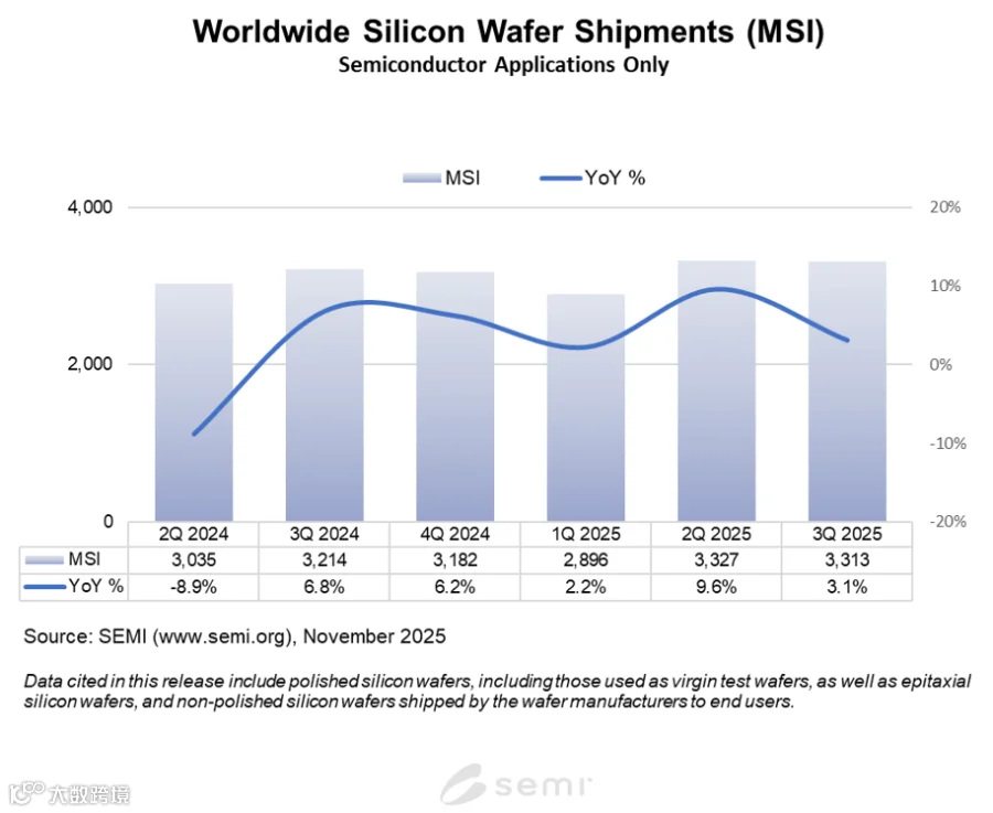美国加州时间2025年11月4日,根据SEMI旗下Silicon Manufacturers Group (SMG)发布的硅片行业季度分析报告,2025年第三季度全球硅晶圆出货量同比增长3.1%,达到3313百万平方英寸(MSI),2024年同期为32.14亿平方英寸。环比来看,出货量较今年第二季度的3327百万平方英寸下降0.4%,显示出外延晶圆等领域在复苏过程中仍存在疲软迹象。