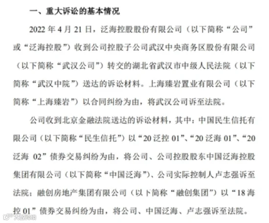 今年4月,泛海控股发布了一则公告。因合同纠纷和债券交易纠纷,泛海被