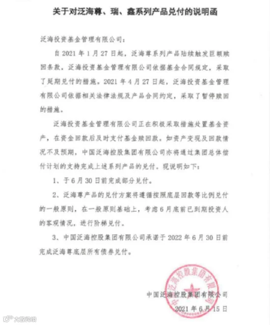 “公司正在积极采取措施处置基金资产,在资金回款后积极支付基金赎回款。如资产变现及回款情况不及预期,中国泛海控股集团有限公司亦将通过集团总体偿付计划的支持完成上述系列产品的兑付。”说明函显示,会于2021年6月30日前完成部分兑付,并承诺于2022年6月30日前完成泛海尊底层债券所有兑付。