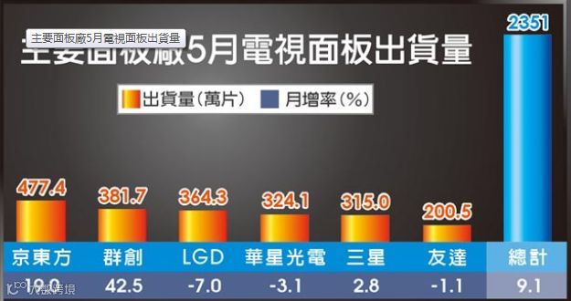 群创4月出货偏低,主力尺寸39.5吋和50吋库存压力不小,因此同样透过专案方式,顺利去化近4成的39.5吋库存,出货量大增136%,达137万片,促使群创5月电视面板出货达381.7万片,月成长42.5%,出货排名重回第二。
