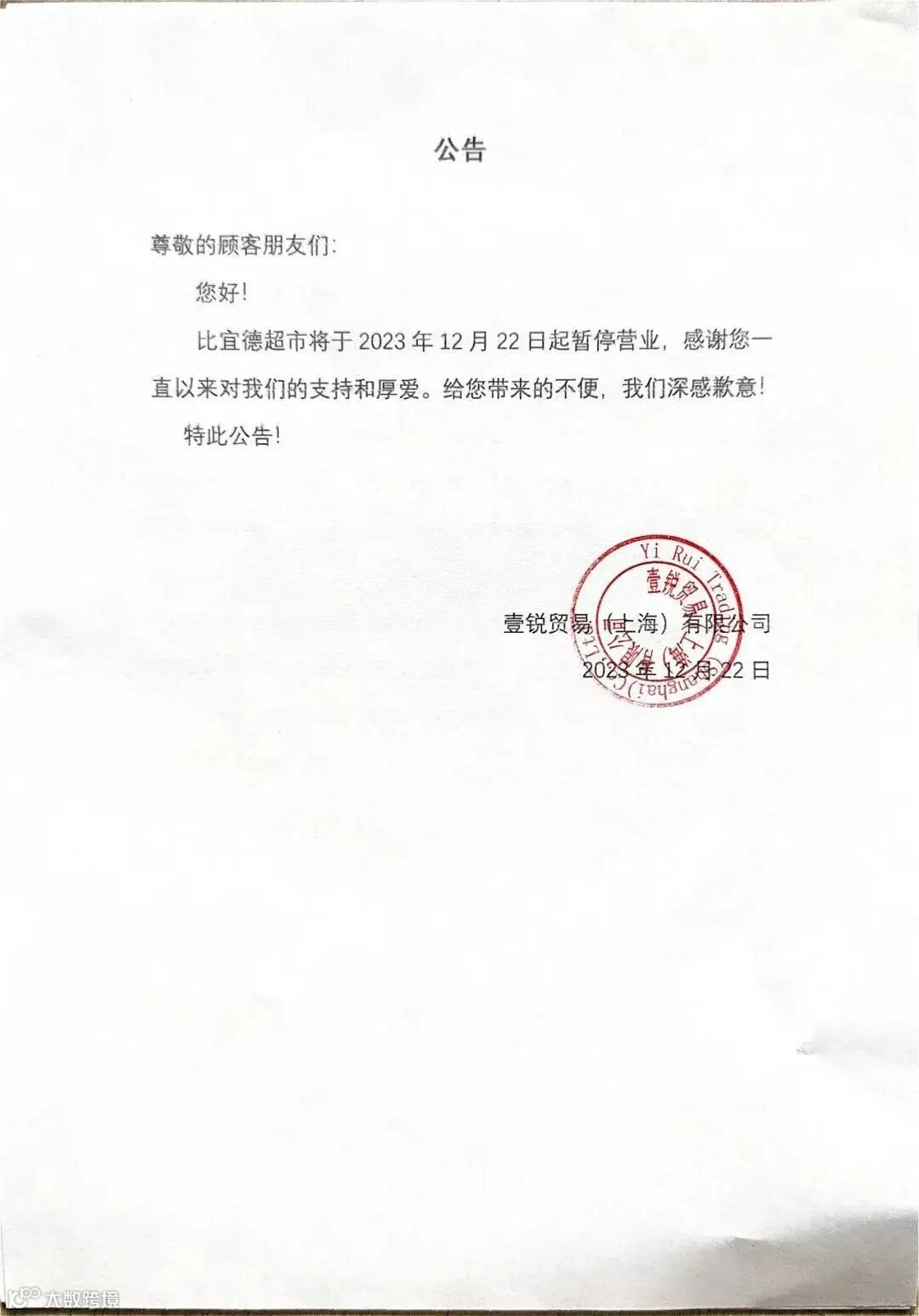 就在日前,主打低价的比宜德连锁折扣超市突然停业,根据其发布的公告显示,比宜德超市于2023年12月22日起暂停营业。