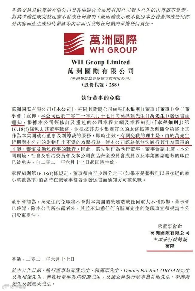 6月18日,万洲国际曾发布公告称,万洪建近期对公司的财物作出不当的攻击行为,被免去董事等职务,即时生效。
