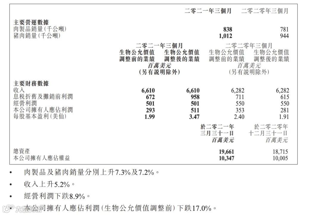 万洲国际目前披露的一季报显示,公司前三个月实现营业收入66.10亿元,实现归母净利润为2.93亿元。