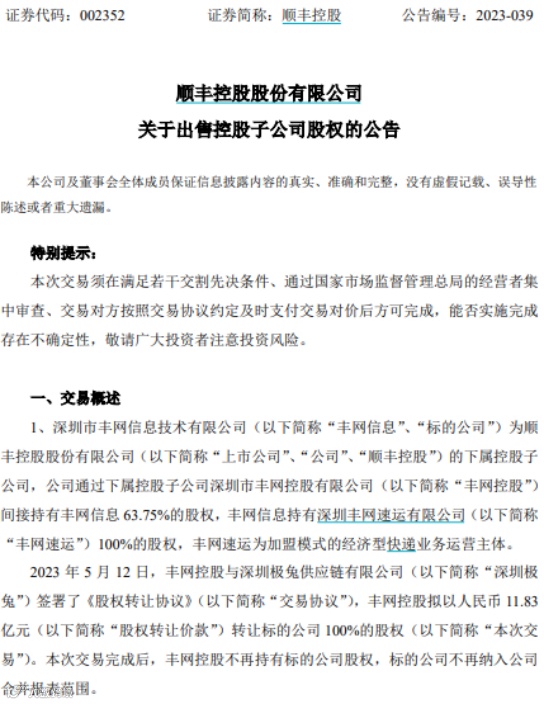 5月12日,顺丰控股宣布,公司控股子公司丰网控股与深圳极兔供应链有限公司(下称“深圳极兔”)签署协议,拟以11.83亿元的价格,向深圳极兔转让丰网信息100%股权,后者的核心资产是丰网速运。交易完成后,丰网速运将从顺丰控股体系中剥离。