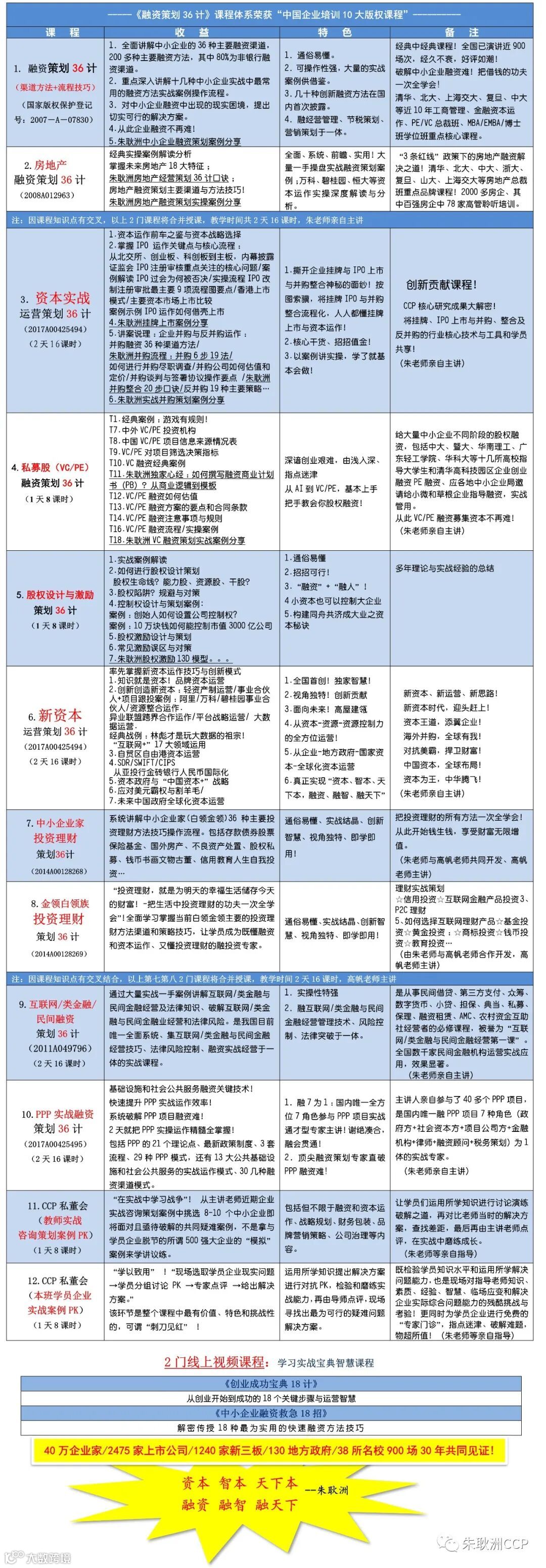 与名师面对面,帮您解决融资难题。学习资本策划CCP,就有机会获得我国著名融资实战策划专家朱耿洲老师的亲自指点!朱老师破解融资困局三十年四千例,被企业家誉为“中小企业融资实战策划第一人” !其融资策划方法创新高超、实战可用、一招破局。这样,既可以学到知识,又能解决企业融资难题,又可结识名师,真正物超所值!