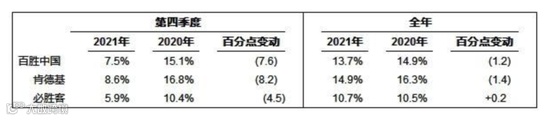 在餐厅利润率上,2021年全年肯德基利润率为14.9%,同比下降1.4个百分点;第四季度肯德基单季餐厅利润率出现腰斩,为8.6%,去年同期则为16.8%。