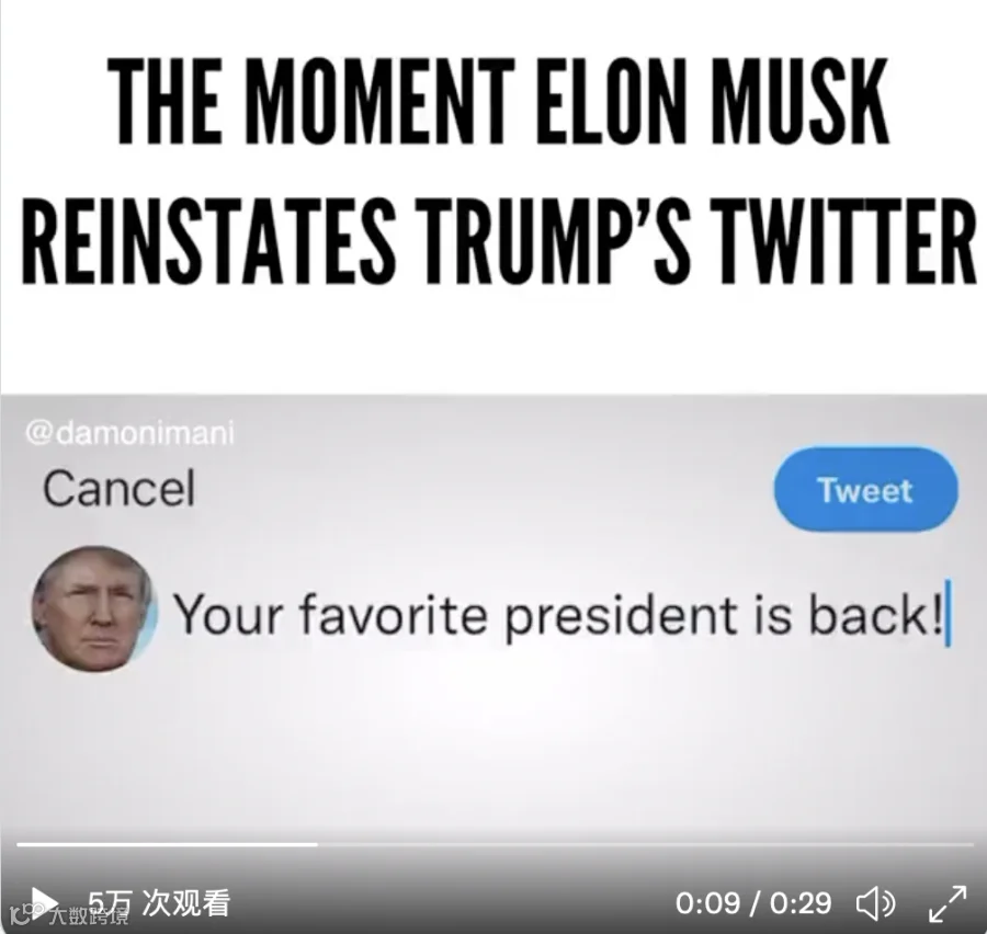 马斯克号称追求“言论自由”,加之其与拜登的尴尬关系,推友们纷纷发文“解封川普”,一个“最爱的总统回来了”的视频广泛传播。