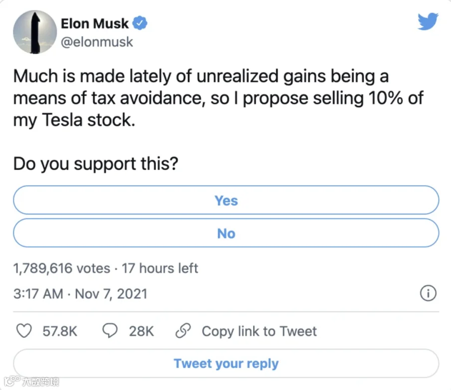 去年11月,特斯拉CEO埃隆马斯克在推特上邀请网友投票,共同决定他是否应该出售价值超过200亿美元的特斯拉股票并纳税。推特用户对此表示“是”,马斯克在11月减持套现了50亿美元。