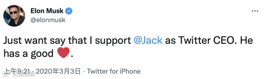 2020年3月,对冲基金Elliott Management对多西发动攻势,并推选新任首席执行官时,马斯克支持多西,在推特上写道,我只想说我支持多西担任推特首席执行官,他人很好的,并加了一个比心的表情。