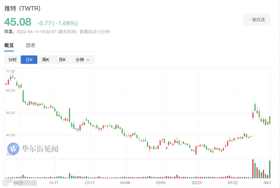 推特股价也随着事态的一波多折而大起大落(公众号:朱耿洲CCP),推特宣布马斯克加入董事会消息后,推特迎来了2013年上市以来股价上涨最快的一天,单日暴涨27%。马斯克宣布不加入后,推特盘前跌6%。