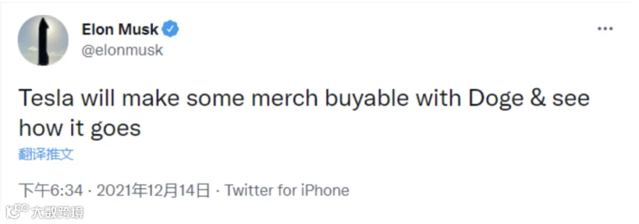 去年12月,马斯克表示,未来将可使用狗狗币(Dogecoin)购买一些特斯拉周边产品,狗狗币一度飙涨33%,24小时涨幅超20%。