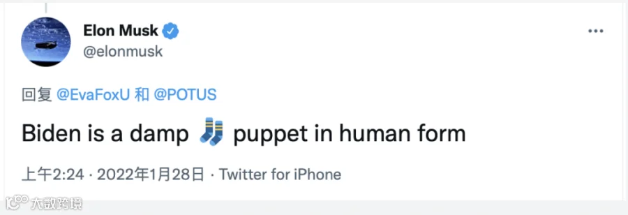这引起了马斯克的不满,他曾多次发推文嘲笑讽刺拜登,比如“拜登把美国公众当成傻瓜”、“拜登是一个人形湿袜木玩偶”(公众号:朱耿洲CCP)。