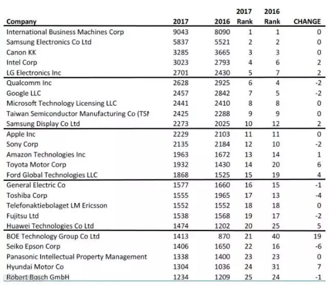 各国科技行业和科技公司之间的较量,除了市场份额之外,专利数量成为一个衡量发展水平高低的重要指标。据外媒最新消息,最近公布的美国2017年专利统计数据显示,中国公司增长三成,成为黑马,其中华为和京东方进入了全球前25名。