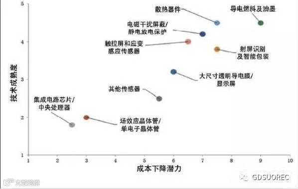 壹行研从技术成熟度和成本下降潜力这两个主要的指标对未来五到十年最可能大规模应用的九个石墨烯电子应用做了全面的评估。这九大石墨烯电子应用分别是导电浆料及油墨、散热器件、射频识别及智能包装、电磁干扰屏蔽及静电放电保护、触控屏和应变感应传感器、其他传感器、大尺寸透明导电膜/显示屏、场效应晶体管/单电子晶体管、集成电路芯片/中央处理器等。