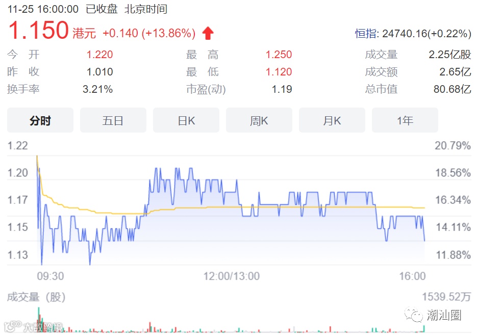 佳兆业集团在今日复牌并实现大涨近21%,最终以上涨13.86%收盘,股价为1.15元/股,总市为80.68亿元。