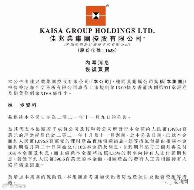在此之前,由于深圳锦恒财富管理有限公司发行、佳兆业集团(深圳)有限公司担保的财富产品出现逾期兑付的情况,佳兆业集团股票自11月5日起暂停买卖。