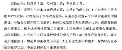 记者注意到,在《关于补选王东虎为第四届董事会非独立董事的议案》中,王坚强也投出了反对票。