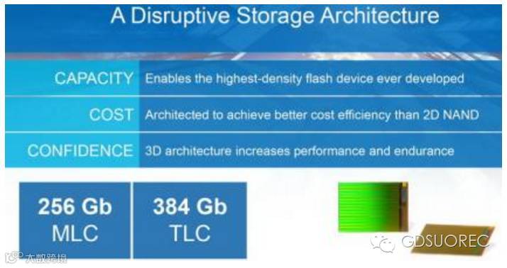 这几家厂商中,Intel、美光的3D NAND闪存来的最晚,去年才算正式亮相,不过好菜不怕晚,虽然进度上落后了点,但IMFT的3D NAND有很多独特之处,首先是他们的3D NAND第一款采用FG浮栅极技术量产的,所以在成本及容量上更有优势,其MLC类型闪存核心容量就有256Gb,而TLC闪存则可以做到384Gb,是目前TLC类型3D NAND闪存中容量最大的。
