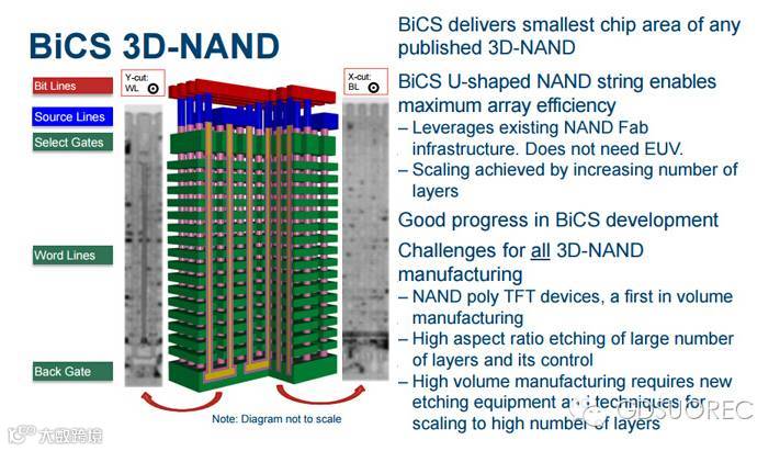 东芝是闪存技术的发明人,虽然现在的份额和产能被三星超越,不过东芝在NAND及技术领域依然非常强大,很早就投入3D NAND研发了,2007年他们独辟蹊径推出了BiCS技术的3D NAND——之前我们也提到了,2D NAND闪存简单堆栈是可以作出3D NAND闪存的,但制造工艺复杂,要求很高,而东芝的BiCS闪存是Bit Cost Scaling,强调的就是随NAND规模而降低成本,号称在所有3D NAND闪存中BiCS技术的闪存核心面积最低,也意味着成本更低。