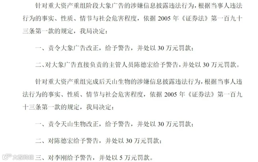 大象广告及其法定代表人陈德宏等在重组交易过程中涉嫌虚增银行存款、营业成本虚减、虚构应收账款、隐瞒担保及负债等事项,诱骗天山生物并购大象广告,导致天山生物在并购中遭受巨大损失。