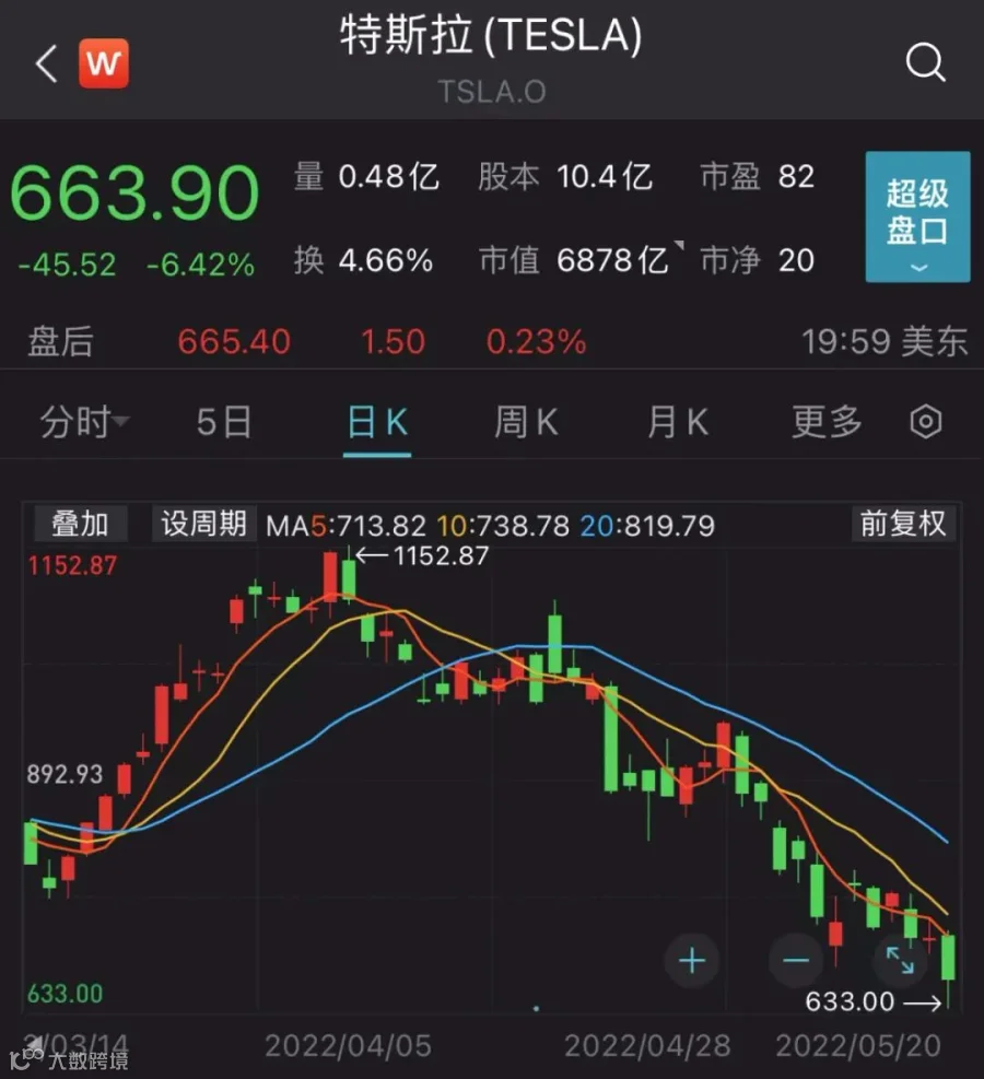 继美东时间5月18日、19日分别下跌6.8%、0.05%后,5月20日收盘,特斯拉再跌6.42%。