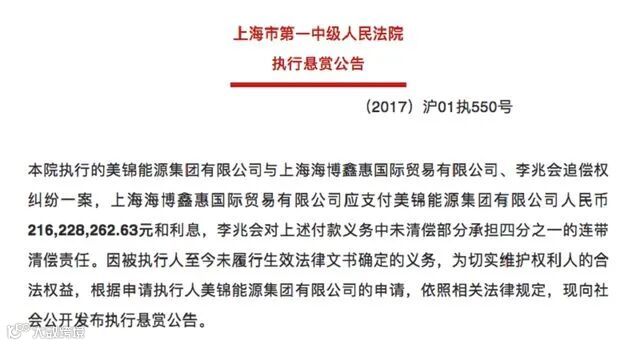 9月15日,上海一中院发布一则执行悬赏公告,被悬赏的对象是山西前首富李兆会。