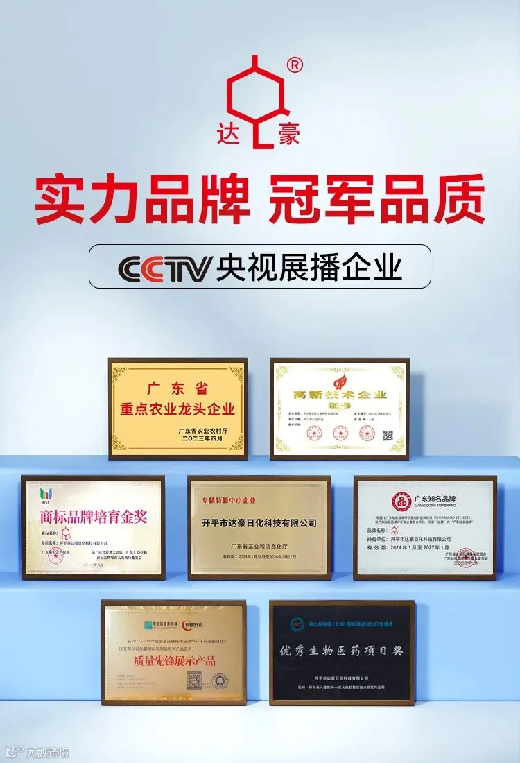公司成功注册13个核心商标,累计获得80+项专利及产品著作权,并先后被认定为“广东省重点农业龙头企业”“广东省专精特新企业”“广东省高新技术企业”、“首届粤港澳大湾区品牌金奖”、“广东知名品牌”、“广东省重点商标保护名录”、“江门市有害生物防控(达豪)工程技术研究中心”“江门市重点农业龙头企业”、“纳税信用A级”、“AAA+级中国质量信用企业”、“守合同重信用企业”、“中国质量先锋展示产品”、“科技进步一等奖”、“配方之星奖”、中国96环保博览会金奖、中国国际技术进出口交易会中国优秀生物医药项目奖等。