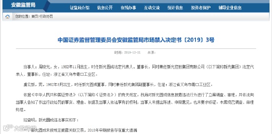 除了债务问题外,新光圆成还涉及多项违法违规行为。2019年12月,新光圆成及相关人员收到中国证券监督管理委员会安徽监管局下发《行政处罚决定书》。其中显示,周晓光、虞云新作为新光圆成董事、实际控制人,其指使、安排新光集团非经营性占用上市公司资金的关联交易事项、上市公司违规担保事项、共同借款事项,不履行信息披露义务,情节严重。