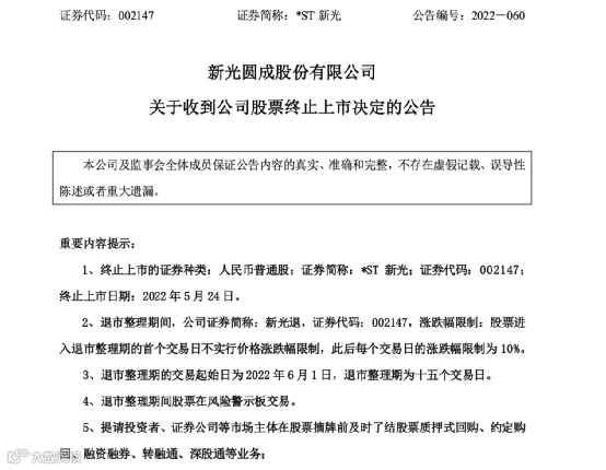 5月24日晚间,*ST新光公告称,深交所决定终止公司股票上市。退市整理期的交易起始日为6月1日,退市整理期为15个交易日。