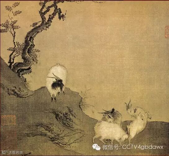 南宋画家陈居中的《四羊图》,纵22.5厘米,横24.1厘米。画中,秋天野地的山坡上,有四只山羊,其中两只小羊正在嬉戏。一只在用力抵角,另一只双蹄腾空跳跃躲闪,旁边的一只羊大概是它们的母亲,神情专注,似乎在照看着自己的孩子们,又似乎在指点着两个小家伙对抗操练。