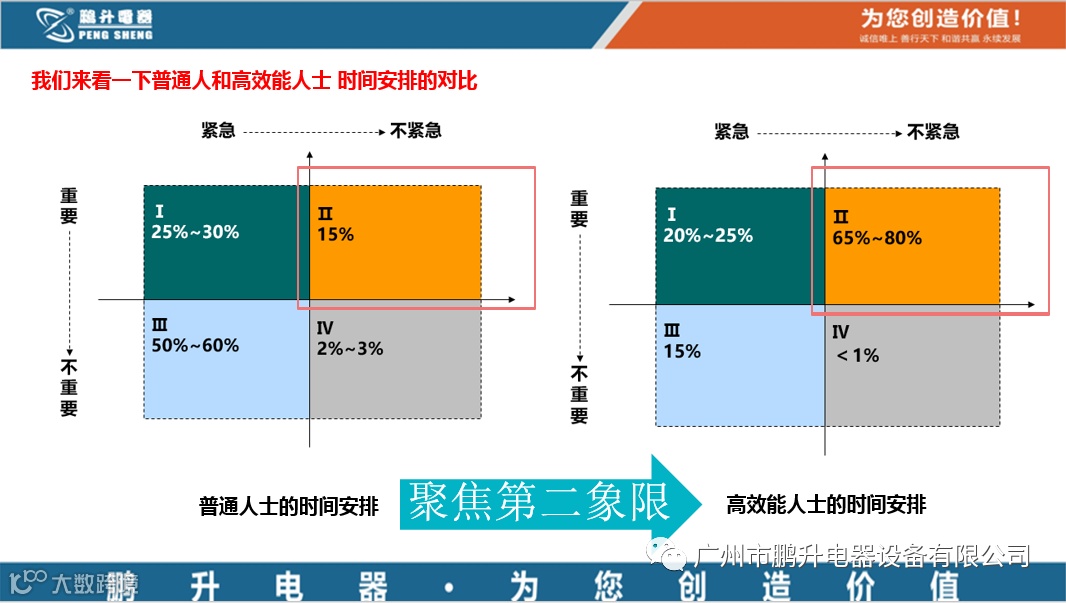 首先张经理为大家讲解了三个时间管理工具:用四象限原理规划时间,用80/20法则分配时间,用ABC控制法使用时间。通过学习四象限原理,我们可以比较清晰的将日常事务归纳为四个不同的类别,然后根据原则安排不同类别事务的处理顺序。我们明白首先要处理重要而紧急的事务,但通过学习80/20法则分配时间,我们知道高效能人士通常会将65%-80%的时间用于处理重要而不紧急的事务(与之相反,普通人会将50%-60%的时间用于处理紧急而不重要的事务,事实上这类事务应该基本交给助手处理),这样就能保证时间产生更高价值,这也是我们通常所说的选择大于努力的效应。不经科学规划瞎忙所产生的时间价值远远不如通过价值分类处理事务所产生的工作价值。通过ABC控制法使用时间,则进一步的将我们每天的高效能工作时间段与ABC类事务相对应,以便于提高处理高价值事务的效率。