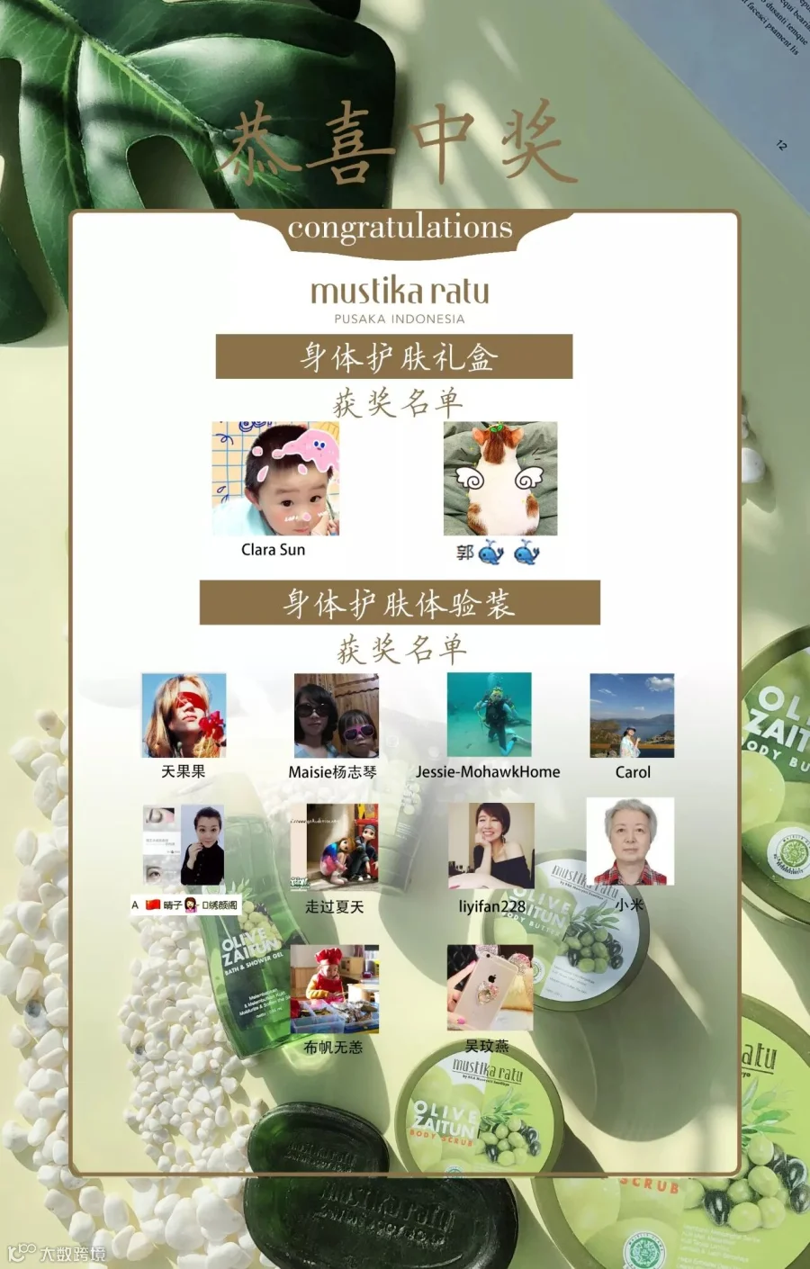 另外,小嘉还抽出了10位获得身体护肤体验装的粉丝,详见获奖名单: