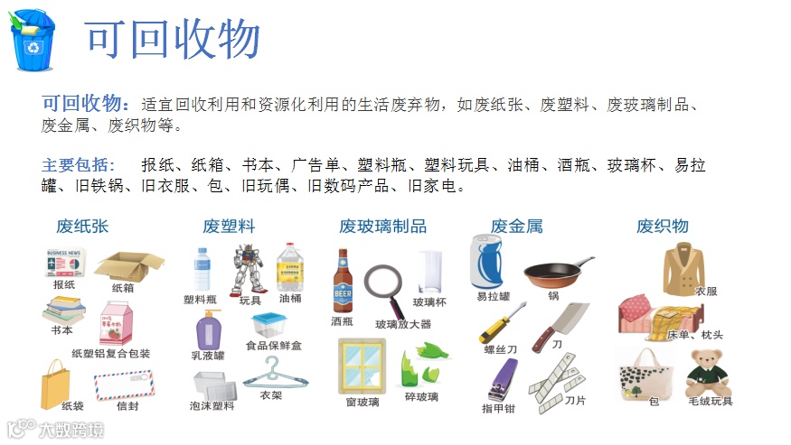 可回收物主要包括废纸、塑料、玻璃、金属和布料五大类。