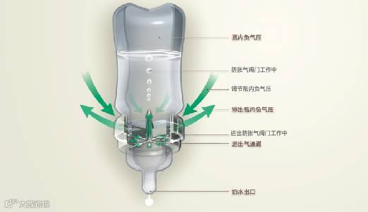 邦霏防胀气奶瓶是一款功能性的防胀气奶瓶,它通过瓶口内的防胀气多通道阀门的循环导气系统把瓶内的负气压平衡到瓶外的空气压力一致;