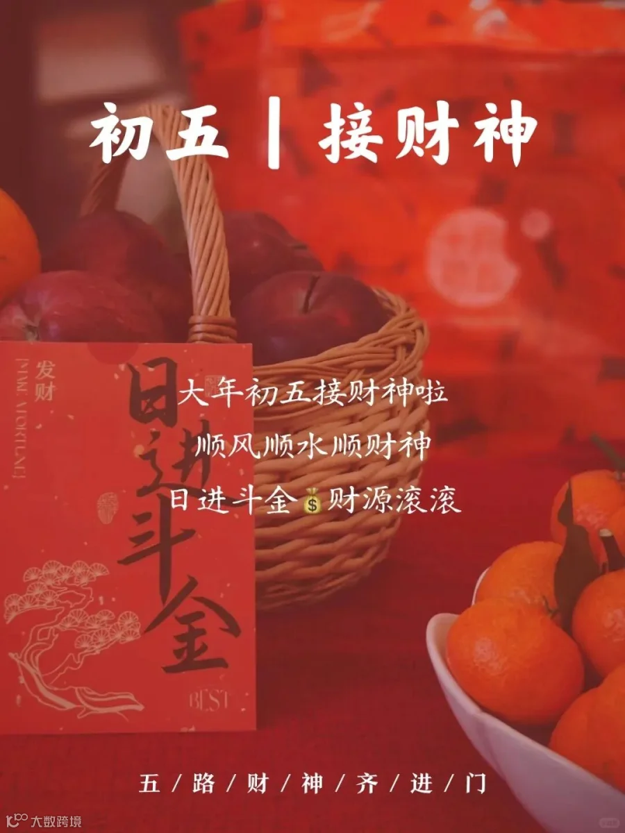 正月初五有著名的迎财神说法,此说法的出处源自传说:传说曾有兄弟五人封号首字皆为“显”,故称“五显财神”。生前他们劫富济贫,死后仍惩恶扬善,保佑穷苦百姓。因此正月初五就有了迎财神这一传说。