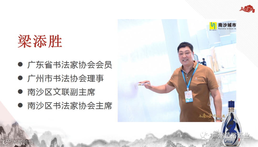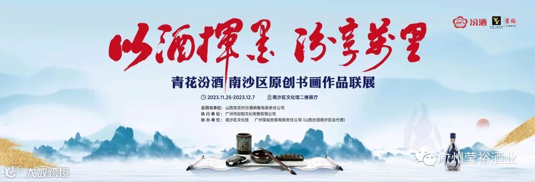 2023年11月25日由南沙区文化馆、山西杏花村汾酒销售有限责任公司、广州莹裕贸易有限责任公司、广州市迎阳文化传播有限公司联合举办的“以酒挥墨 汾享万里”南沙区原创书画作品联展,特别邀请了南沙区三位杰出的书画艺术家:梁添胜、李振华、曾明珠,本次书画联展奉出了他们多年力作150幅。
