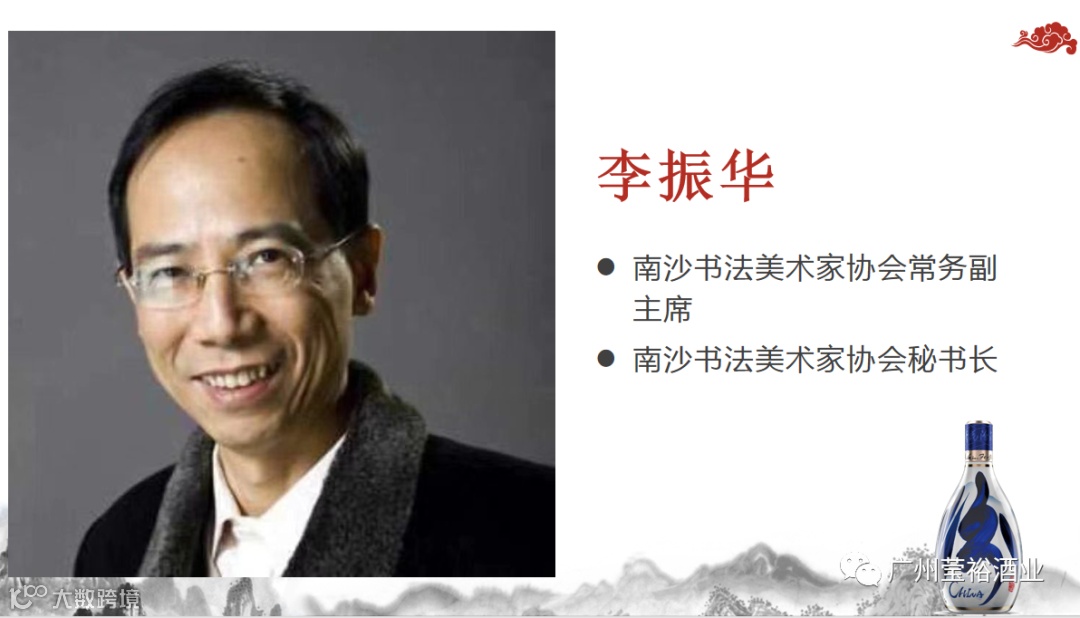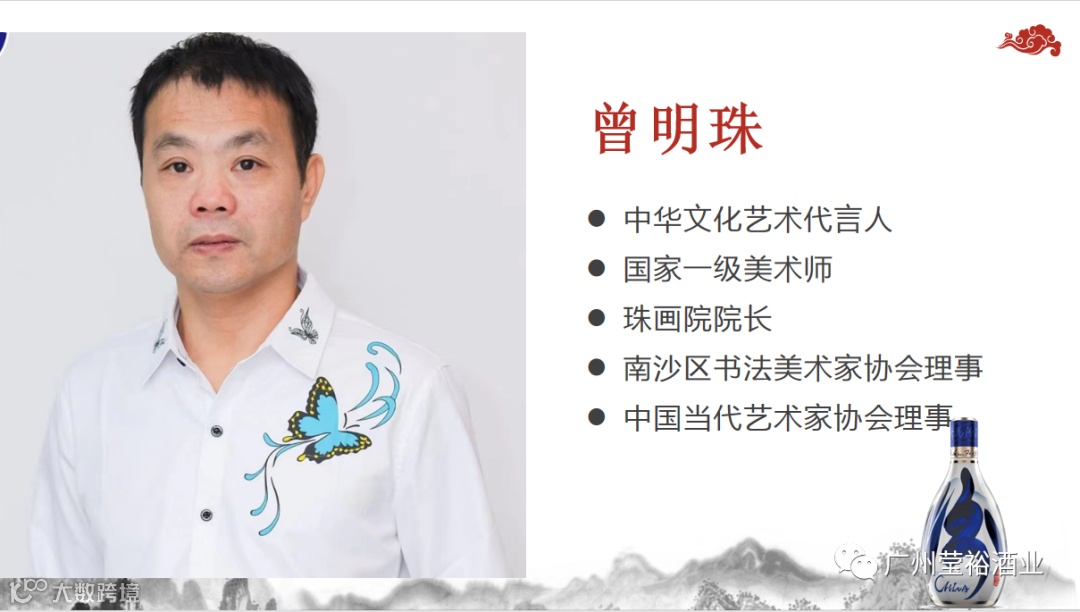 广州莹裕贸易有限责任公司(汾酒南沙总代)董事长、国家一级品酒师谭健蓉女士,从国画角度解析酒文化与艺术的关联。青花汾酒酒瓶将器物、彩、书法、国画、篆刻五种中式元素集于一身,采用青花瓷包装突出清香型汾酒的纯净品质,让人体味到历史悠久的汾酒文化。