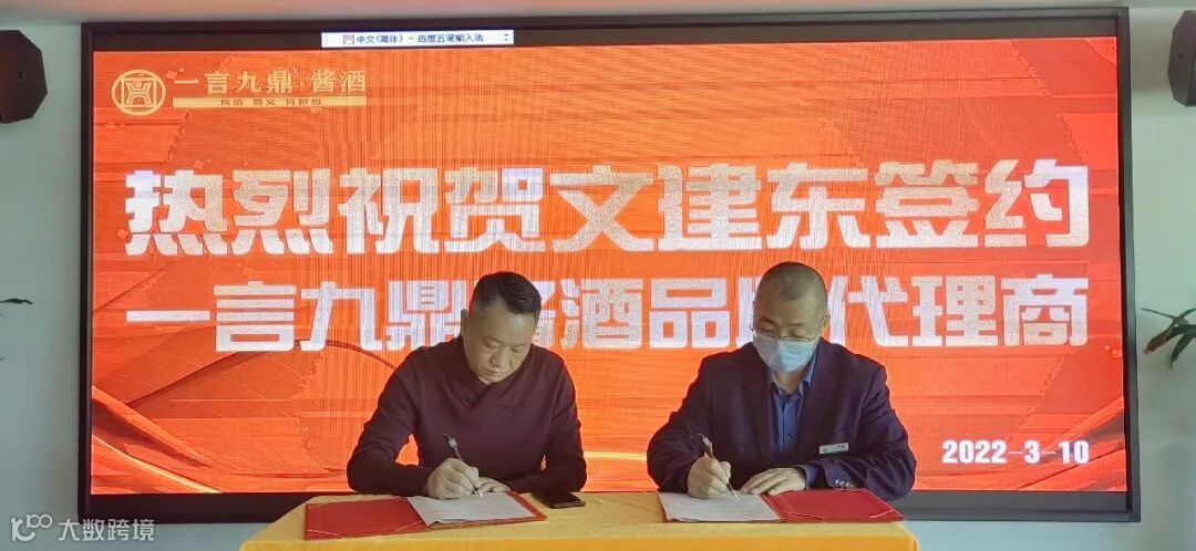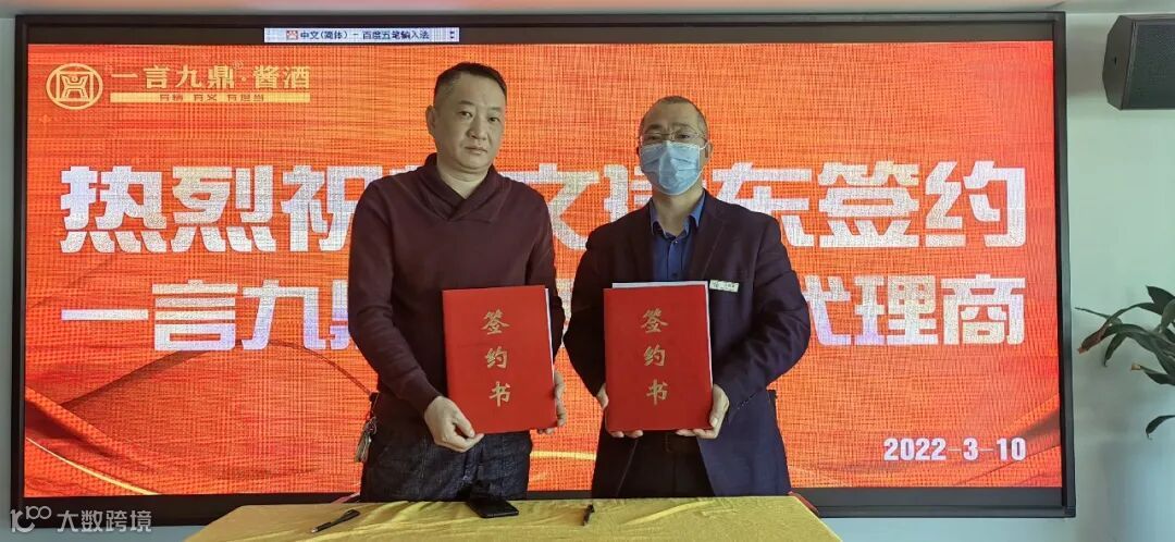 2022年3月10日上午,广东一言酒鼎酒业控股有限公司董事长邓会兵与利驰立刀具文建东文总在一言九鼎酱酒总部成功签约加盟代理商!