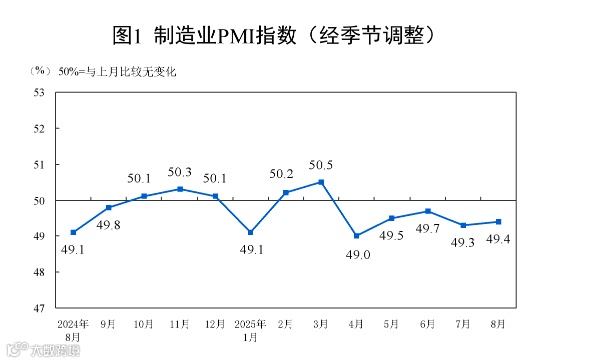 国家统计局8月31日发布的8月份制造业采购经理指数(PMI)为49.4%,比上月上升0.1个百分点,制造业景气水平有所改善。非制造业商务活动指数为50.3%,比上月上升0.2个百分点,非制造业继续保持扩张。