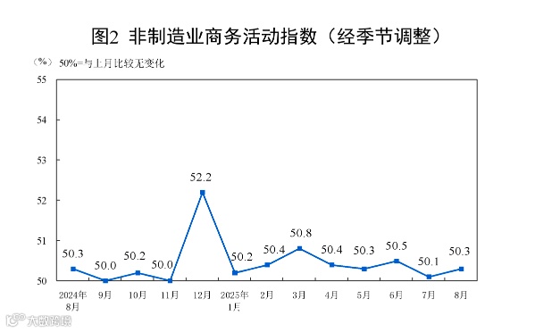 8月份,非制造业商务活动指数为50.3%,比上月上升0.2个百分点,非制造业继续保持扩张。