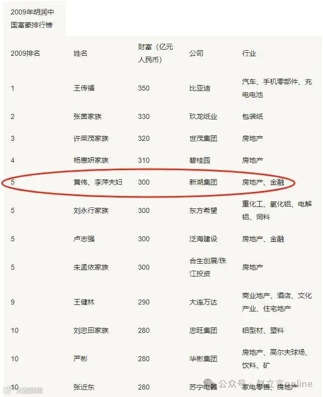 随着“新湖系”的崛起,黄伟的资本版图也开始逐渐扩大。新湖集团先后入主绍兴百大、哈高科等企业,慢慢构建起了一个以房地产为主业,涵盖金融、能源交通等多个领域的庞大帝国。2009年,黄伟以300亿元的身家登上了胡润排行榜,成为了浙江首富。