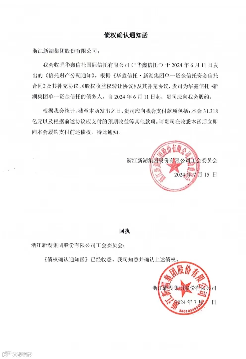 新湖集团发给新湖集团工会的一份函件显示,今年6月初,因突发性事件影响,公司遇到了较大的流动性困难,未能及时向工会划拨资金,导致不能及时归还2024年6月和11月华鑫信托产品的投资款项。7月15日,新湖集团工会分别与新湖集团确认应付信托31.318亿元及相关预期收益,新湖控股确认应付信托15.493亿元及相关预期收益,合计未兑付信托资金达46.811亿元。新湖集团和新湖控股发送回执确认了相关债权。