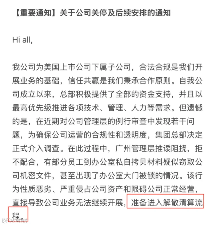 而广州图森下发的通知显示,近期对公司管理层的例行审查中发现若干问题,介入调查过程中广州管理层拒不配合,“有部分员工到办公室私自拷贝材料疑似窃取公司机密文件,甚至出现了办公室大门被锁的情况。该行为性质恶劣、严重侵占公司资产和阻碍公司正常经营,直接导致公司业务无法继续开展,准备进入解散清算流程”。
