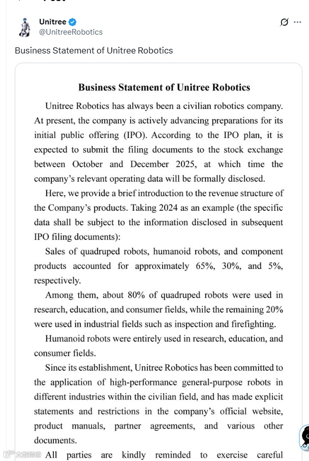 9月2日,宇树科技在社交媒体平台X上发帖称,公司预计在2025年10月至12月期间向证券交易所提交备案文件,届时将正式披露公司的相关运营数据。