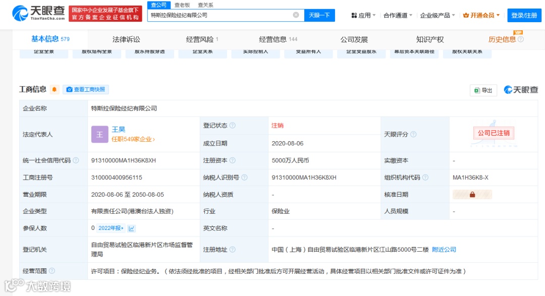 今年4月,天眼查显示,特斯拉保险经纪有限公司的企业状态由存续变更为注销。