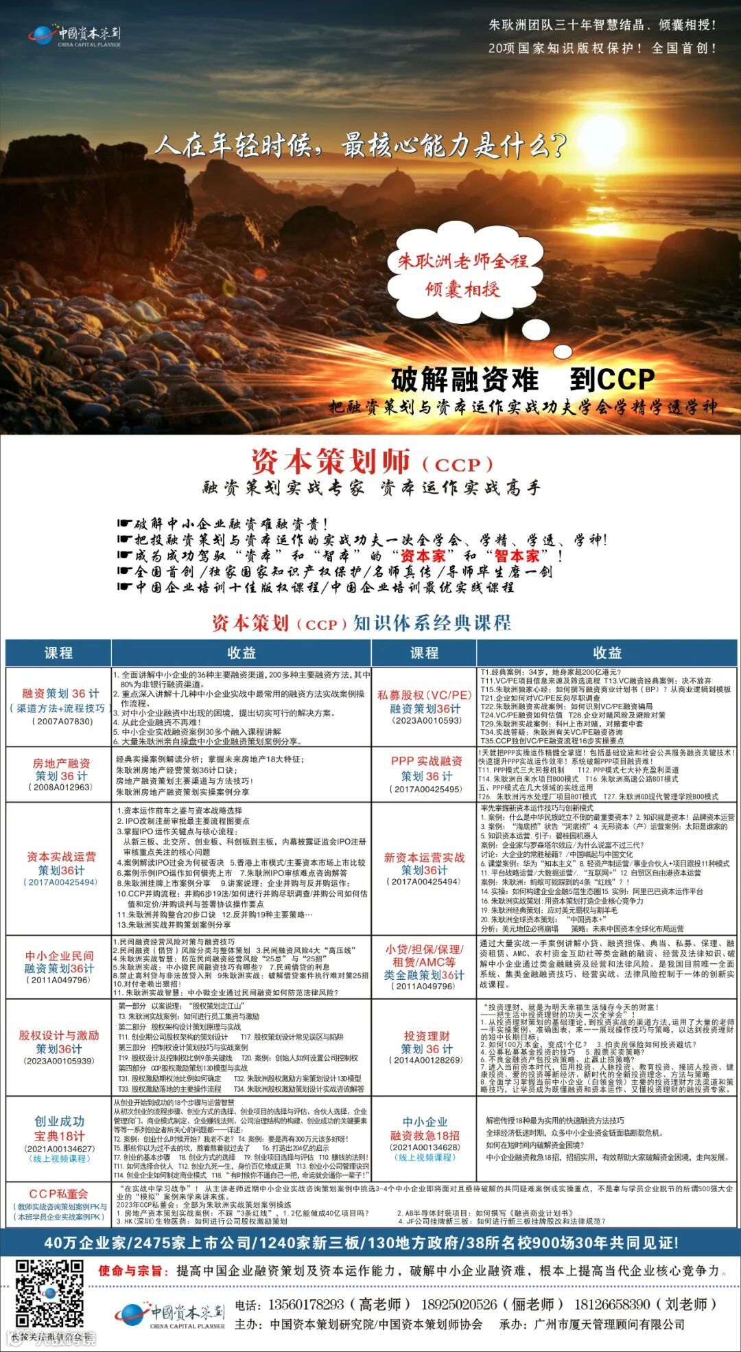 一方面为帮助小贷/典当/担保/保理/租赁/区域性股权市场/资产管理(AMC)七个类金融企业解决好自身经营发展、风险应对与法律策划问题,另一方面为广大中小微企业家解决如何从类金融企业融资的难题,中国资本策划研究院院长、著名资本策划实战专家朱耿洲博士精心钻研,独创 《小贷/典当/担保/保理/租赁/区域性股权市场/AMC等类金融策划36计》课程,现经中国版权保护中心审核登记,获得国家知识版权,登记号:国作登字-2024-M-00196300 。这是朱耿洲博士第21项知识版权作品,也是朱博士在专注于破解中小企业融资难题、提升当代企业融资策划与资本运作实战核心竞争力方面再谱新篇。