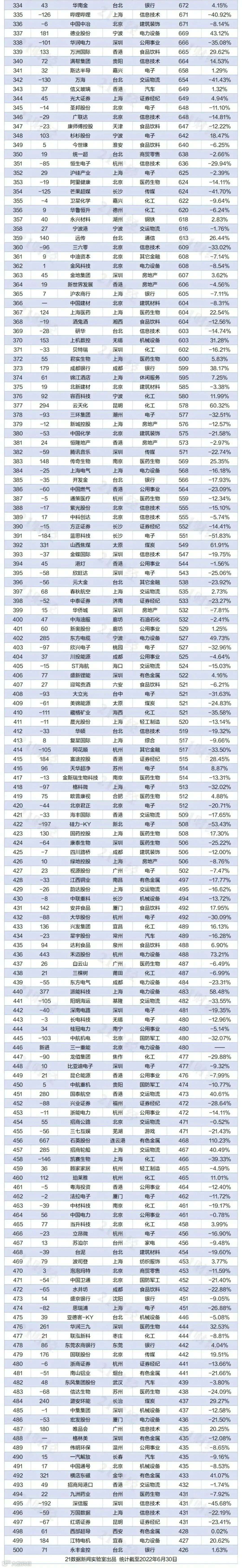 数据显示,最新中国上市公司500强总市值82万亿元,与去年年末相比下滑约7%;入围门槛由去年年末的484.76亿元降至426.42亿元,“守门员”为今年新入榜的永丰金控,上半年市值增长了1.63%,排名却提升了71位。