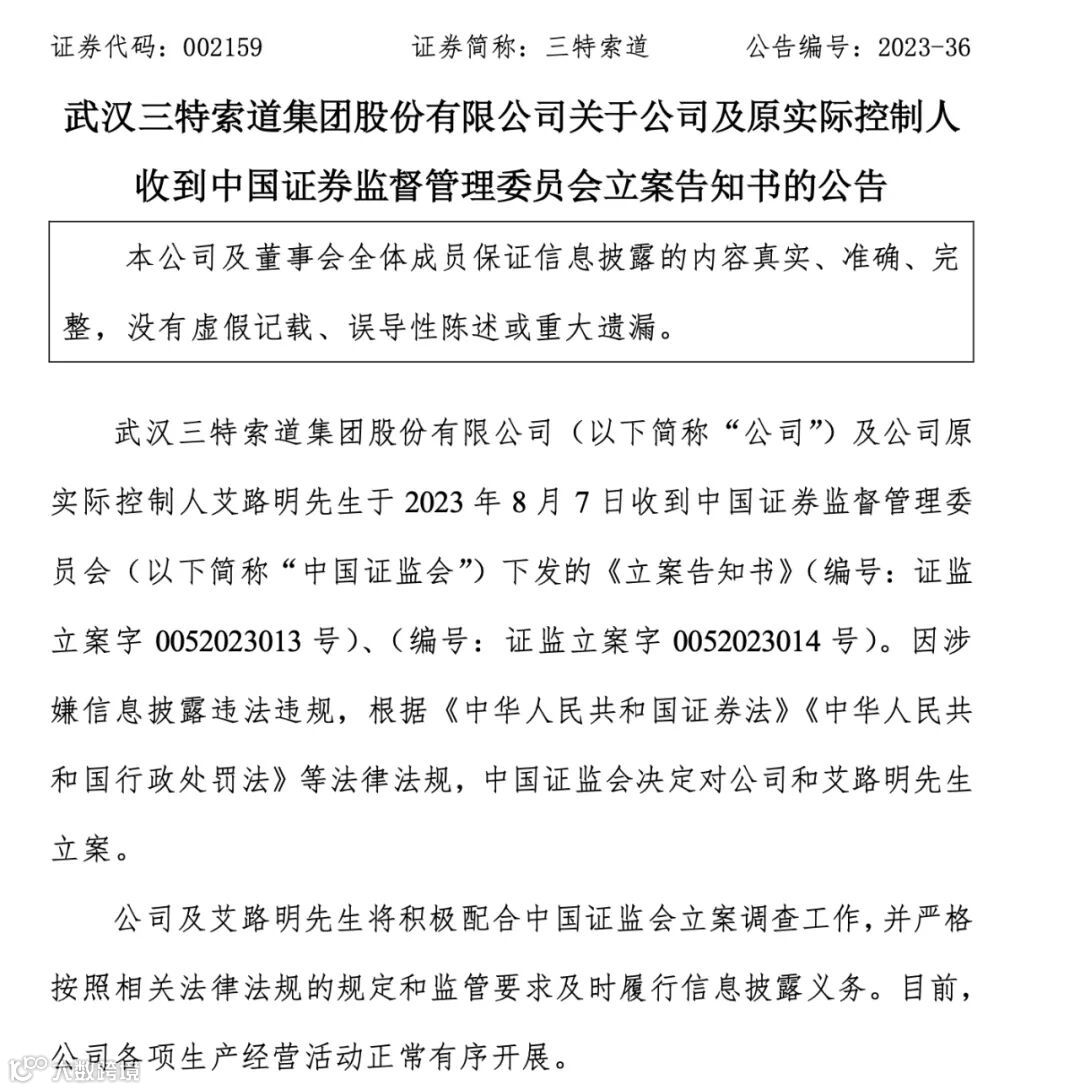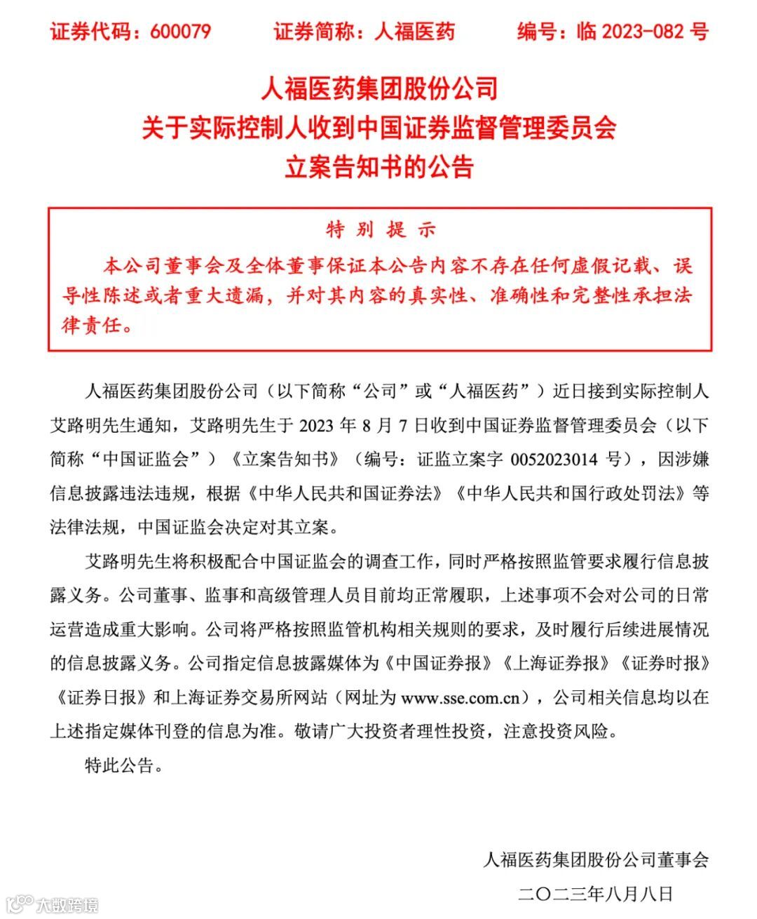 8月7日晚间,人福医药(600079.SH,股价21.69元,市值354.12亿元)发布公告称,因涉嫌信息披露违法违规,公司实际控制人艾路明被证监会立案。与此同时,三特索道(002519.SZ,股价16.67元,市值23.12亿元)也发布公告称,公司及原实控人艾路明被立案。