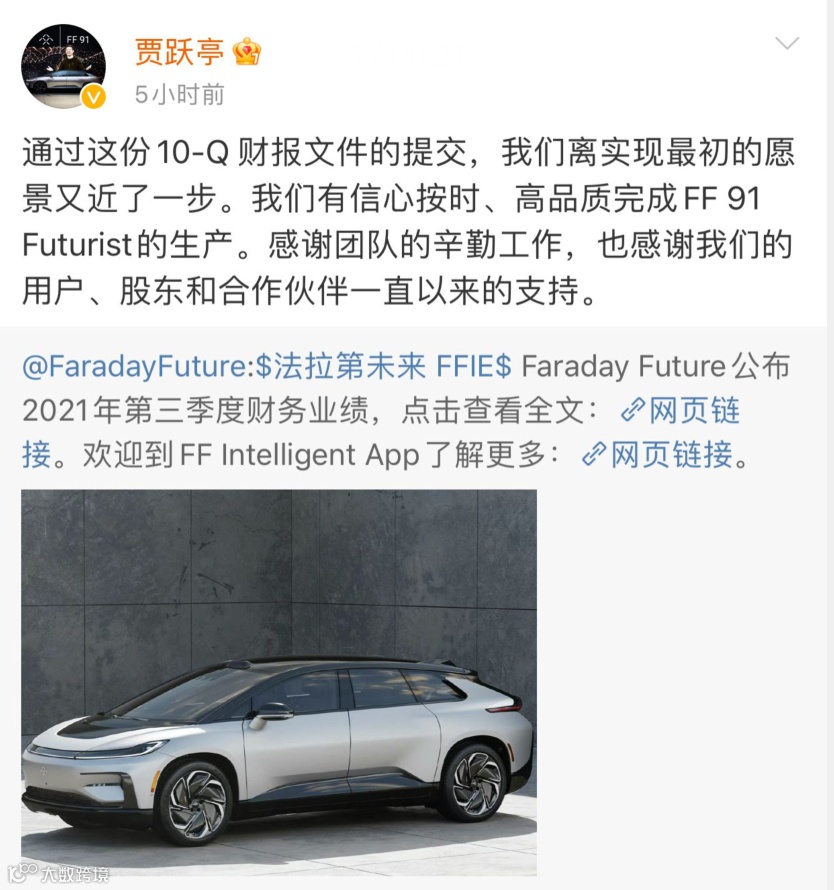 5月7日,贾跃亭转发了一条Faraday Future的博文,并配图称“Faraday Future离实现最初的愿景又近了一步……”