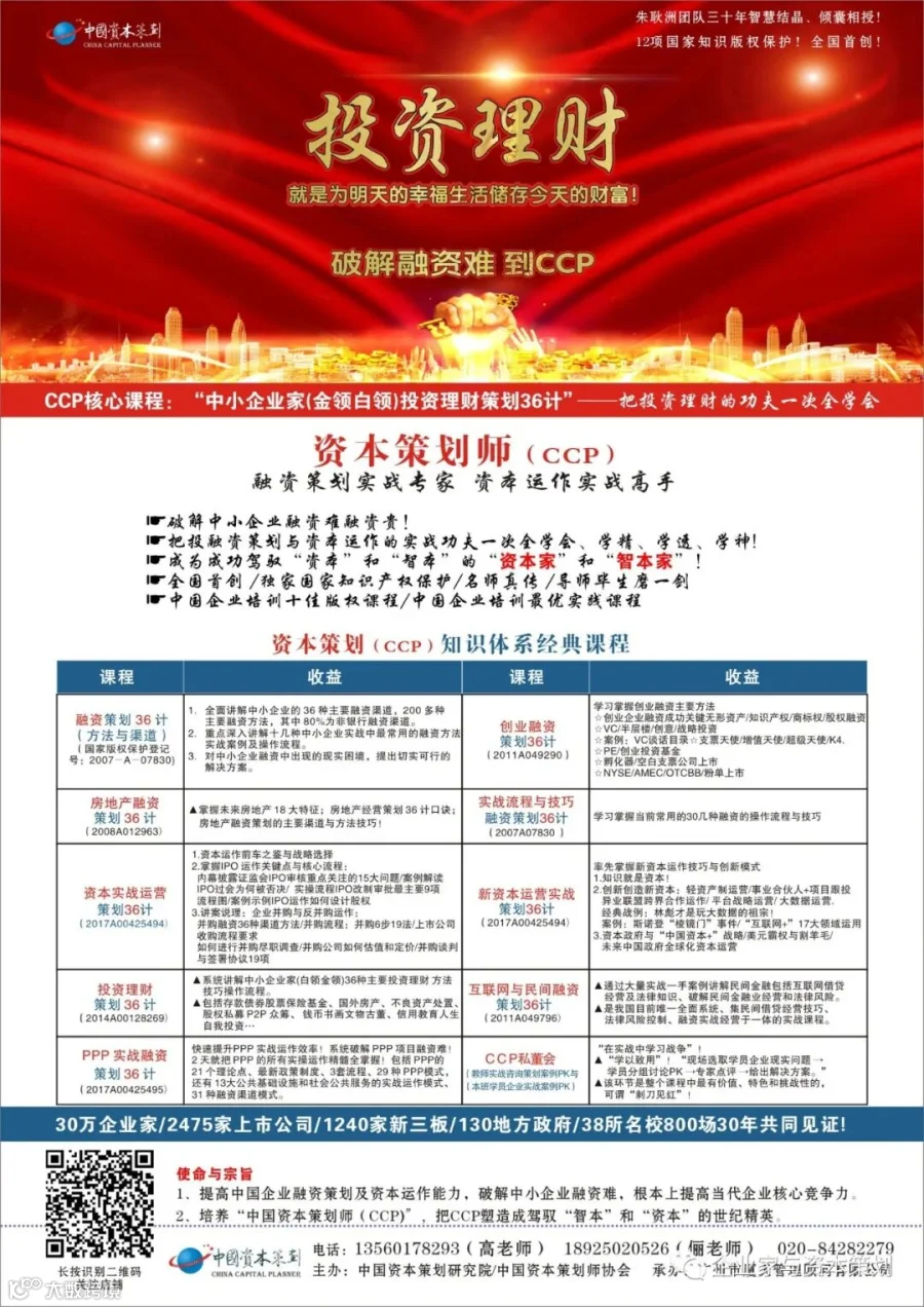 “把投资理财的功夫一次全学会”!全面学习掌握当前中小企业主要的投资理财方法渠道和策略技巧,让学员成为既懂融资和资本运作、又懂投资理财的融投资专家。从此开始钱生钱,享受财富无限增值!